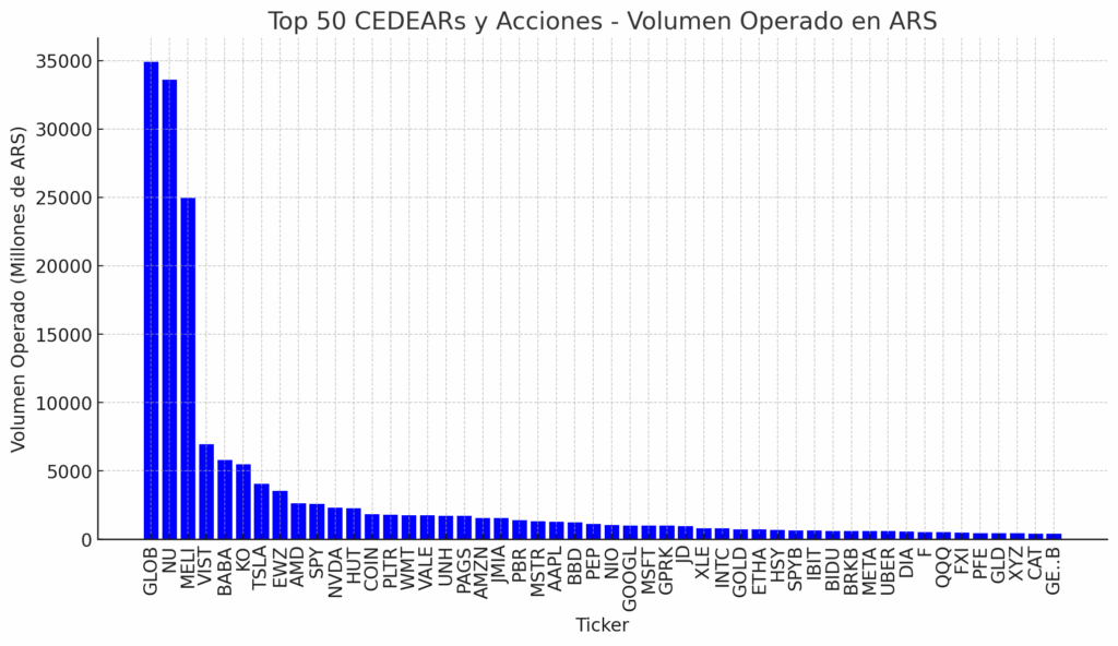 Los cinco principales CEDEARs por volumen operado en pesos argentinos (ARS) fueron: