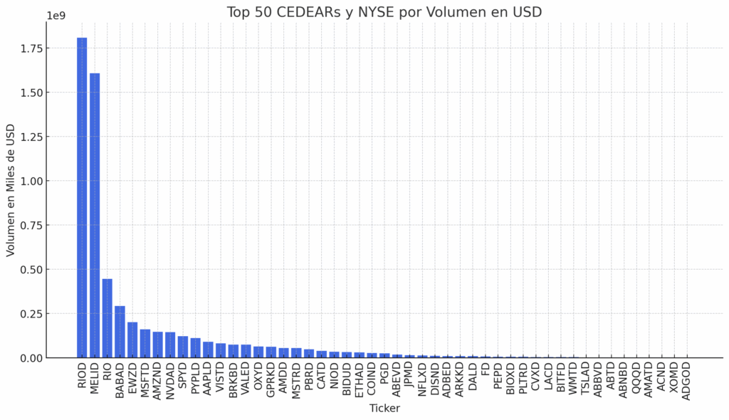 Los cinco principales CEDEARs por volumen operado en dólares estadounidenses (USD) fueron: