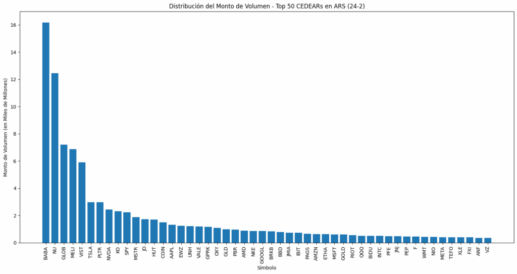 Al cierre de la rueda del 24 de febrero de 2025, el ranking de los 50 CEDEARs con mayor volumen operado en el Merval mostró un claro dominio de ciertos activos en ARS y USD, con algunas variaciones significativas respecto a la jornada previa del 21 de febrero de 2025. En el mercado local, el volumen operado se mantiene dentro de niveles normales, mientras los inversores siguen atentos a la próxima reunión del FOMC en marzo, clave para la dirección de la política económica.