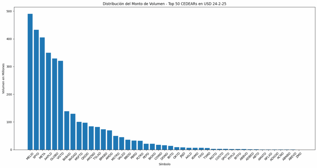 Top 50 CEDEARs con mayor volumen operado del 24-2-2025 en el Merval