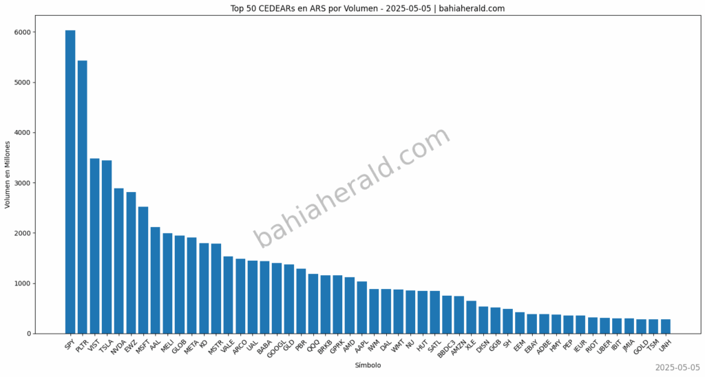 Al cierre de la rueda del lunes 5 de mayo de 2025, el ranking de los 50 CEDEARs con mayor volumen operado en el Merval refleja una jornada de actividad estable en el mercado local, con un volumen operado dentro de los parámetros habituales y un dólar CCL fluctuando entre los $1.208 y $1.219. En el ámbito internacional, los inversores se mantienen atentos a la próxima reunión del Comité Federal de Mercado Abierto (FOMC) de la Reserva Federal de EE.UU., donde se especula una posible baja en la tasa de referencia.