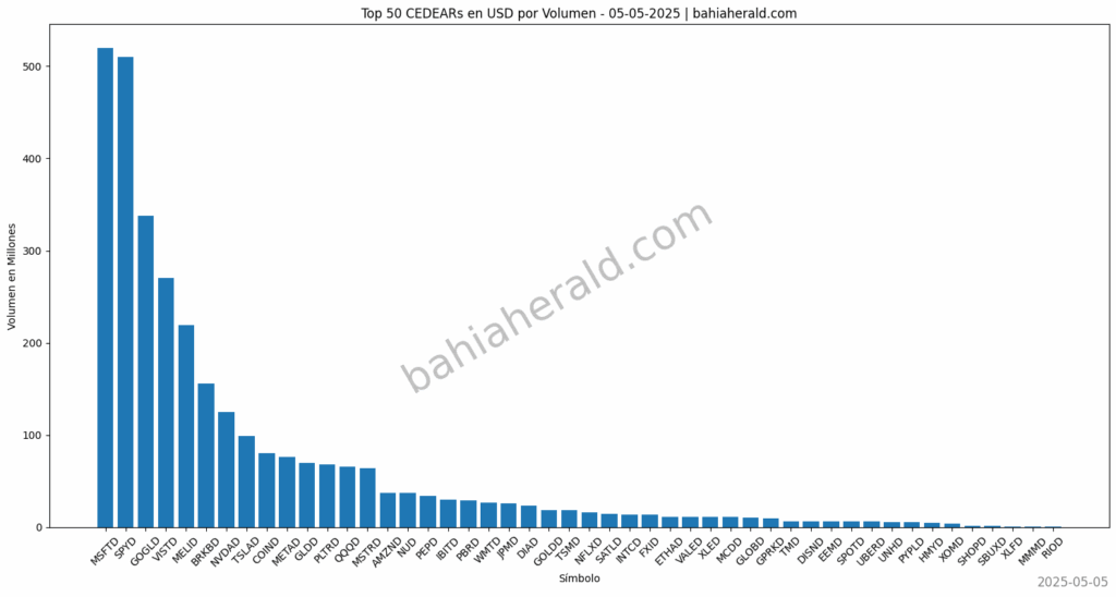 Top 50 CEDEARs con mayor volumen operado del 5-5-2025 en el Merval